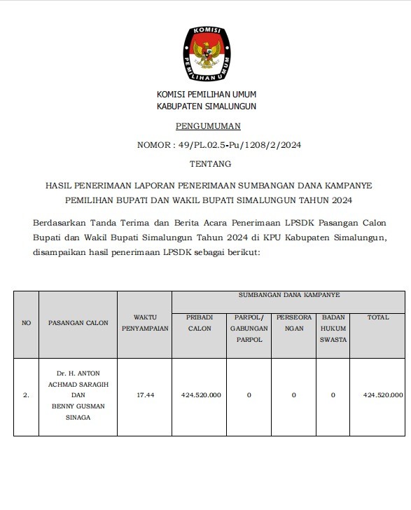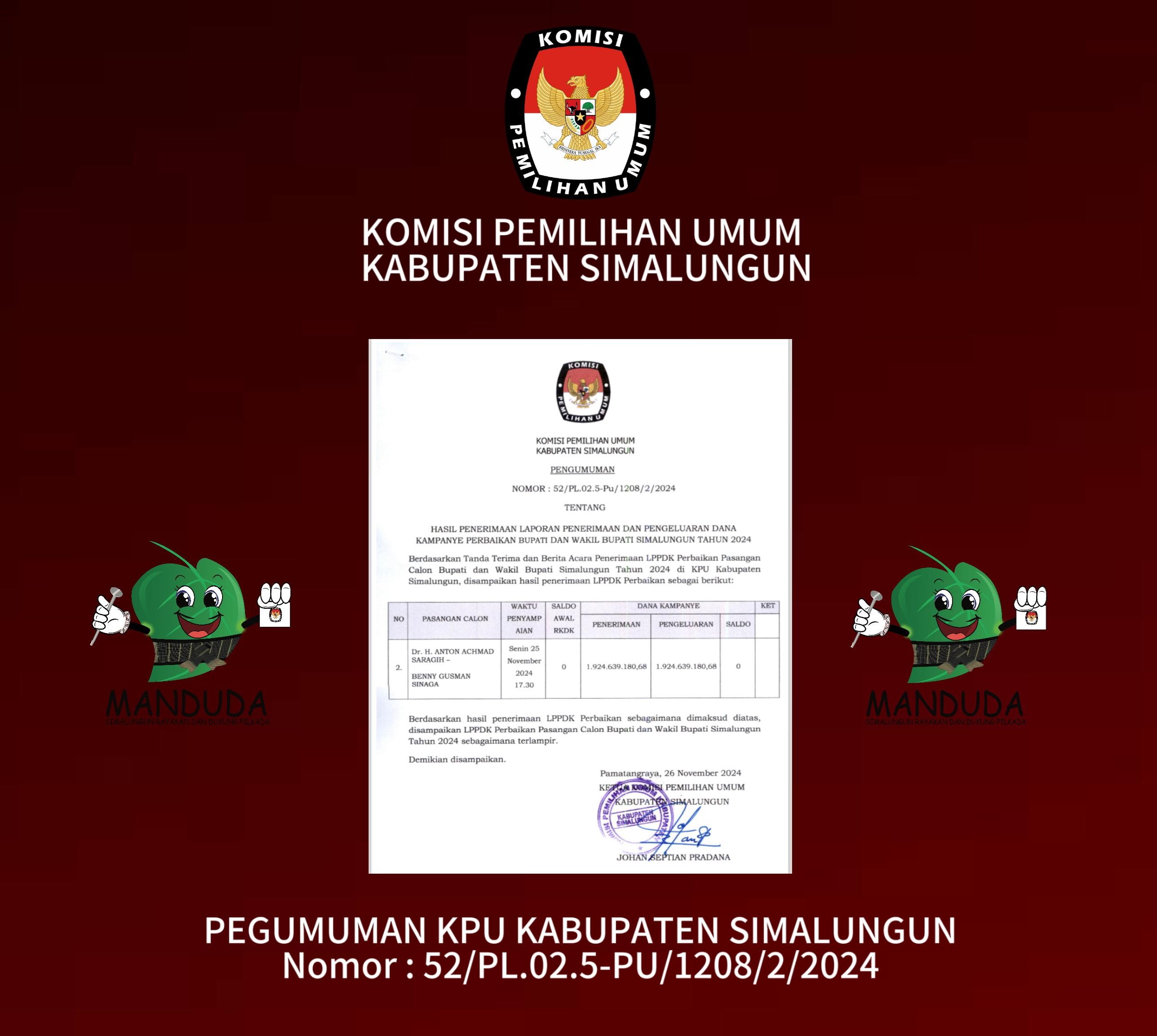 Berikut disampaikan Pengumuman Komisi Pemilihan Umum Kabupaten Simalungun Nomor : 52/PL.02.5-Pu/1208/2/2024 tentang Hasil Penerimaan Laporan Penerimaan dan Pengeluaran Dana Kampanye Perbaikan Pemilihan Bupati dan Wakil Bupati Simalungun Tahun 2024