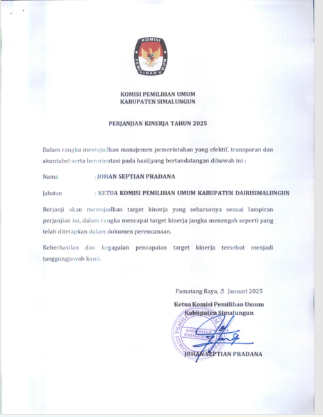 Berikut Perjanjian Kinerja KPU Kabupaten Simalungun Tahun 2025.