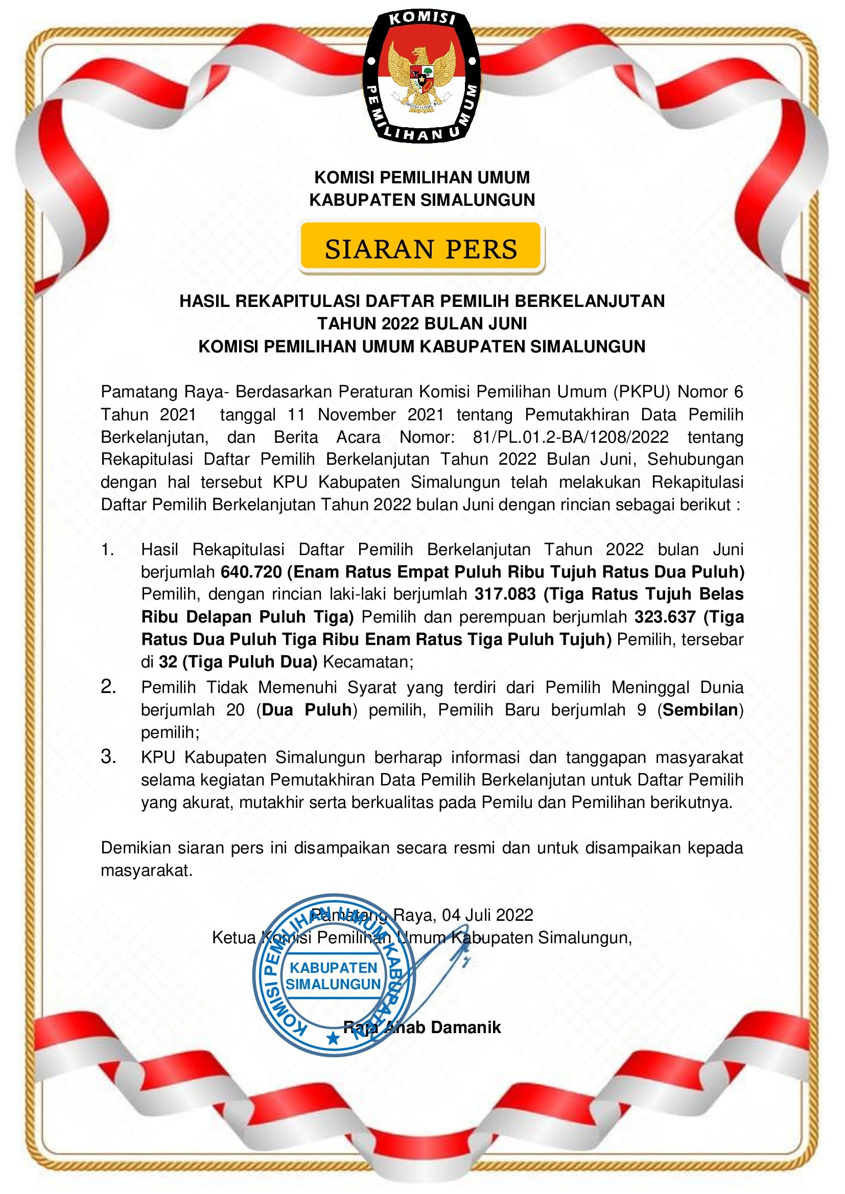 Hasil Rekapitulasi Daftar Pemilih Berkelanjutan KPU Kabupaten Simalungun Bulan Juni Tahun 2022 Kamis, 01 Januari 1970 07:00 360 Siaran Pers KPU Kabupaten Simalungun tentang Hasil Rekapitulasi Daftar Pemilih Berkelanjutan KPU Kabupaten Simalungun Bulan Juni Tahun 2022 Baca Selengkapnya
