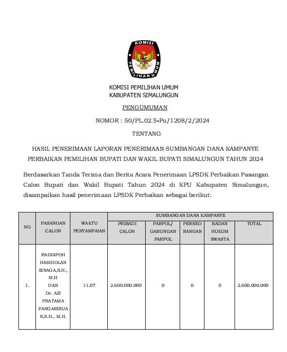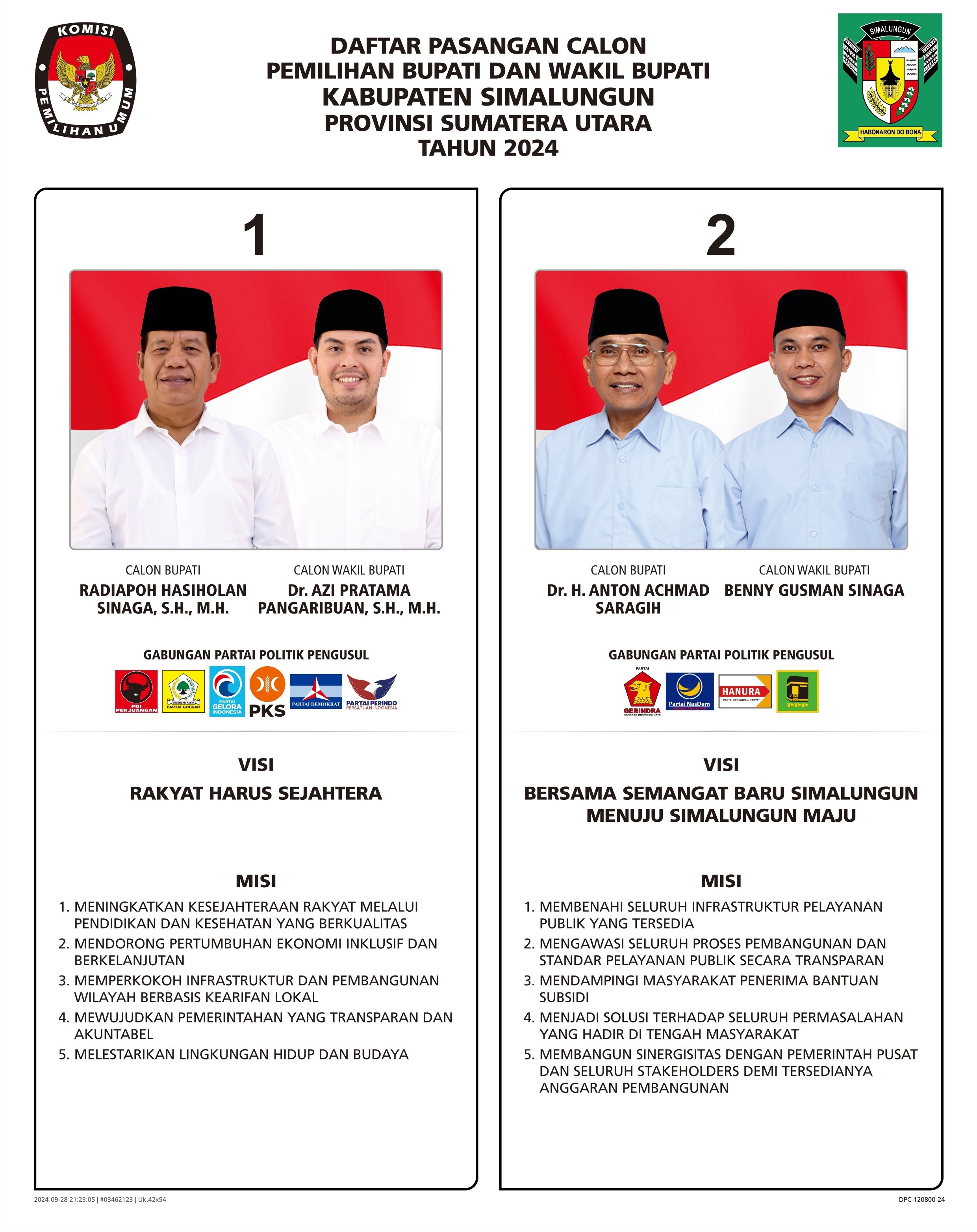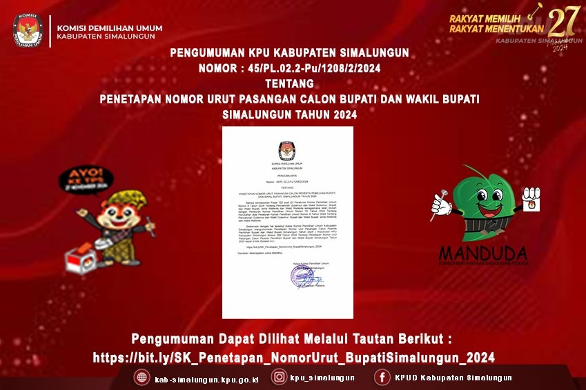 Berikut disampaikan Pengumuman KPU Kabupaten Simalungun Nomor : 47/PL.02.2-Pu/1208/2/2024 Tentang Daftar Pasangan Calon Bupati dan Wakil Bupati Simalungun Tahun 2024.